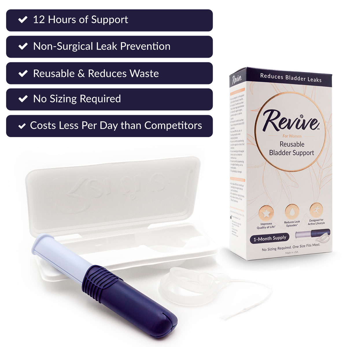- ONE SIZE: Revive is designed to be a one-size-fits-most bladder control device for women. The size and shape of Revive are designed to fit the uniqueness of your anatomy and be both comfortable and effective.