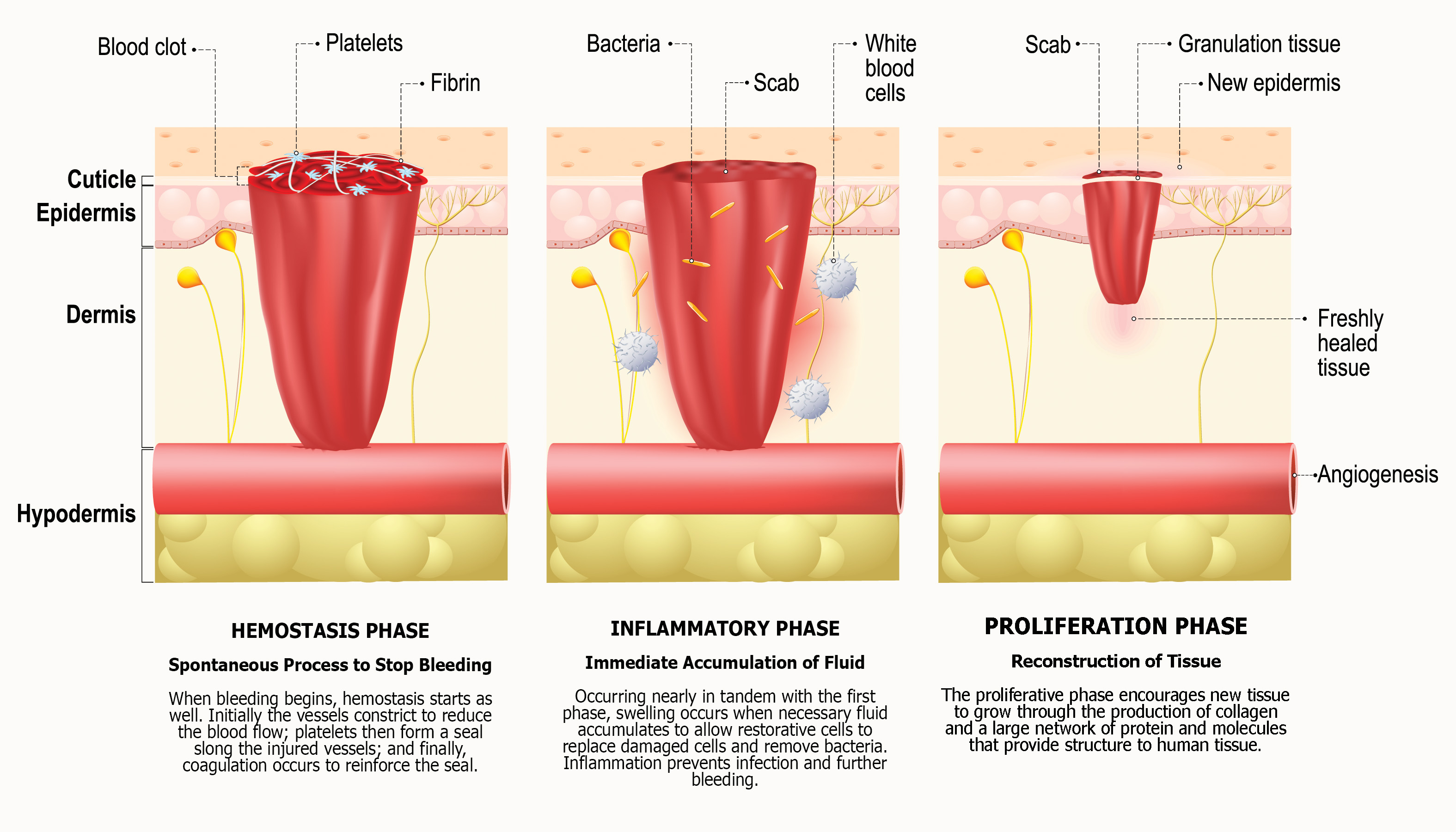 Although the healing process can be interrupted by setbacks caused by external or internal conditions, wounds progress through 4 basic phases in a dependably linear order. The process begins with the Hemostasis phase, followed by the Inflammation, Proliferative, and Remodeling phases. In the final stage, also known as Maturation, the skin's collagen changes to its final form and the wound closes.